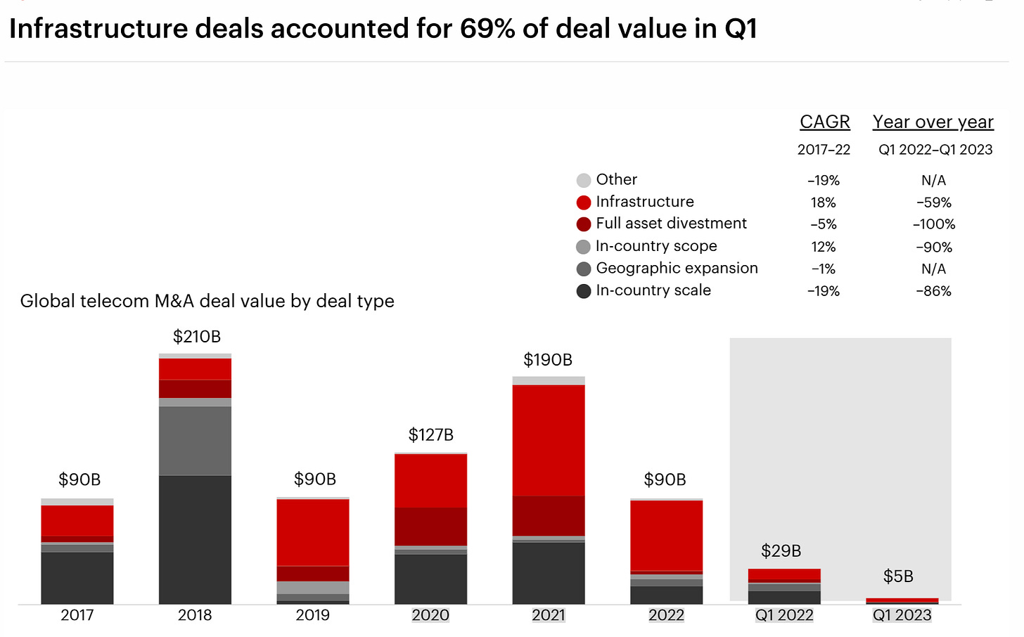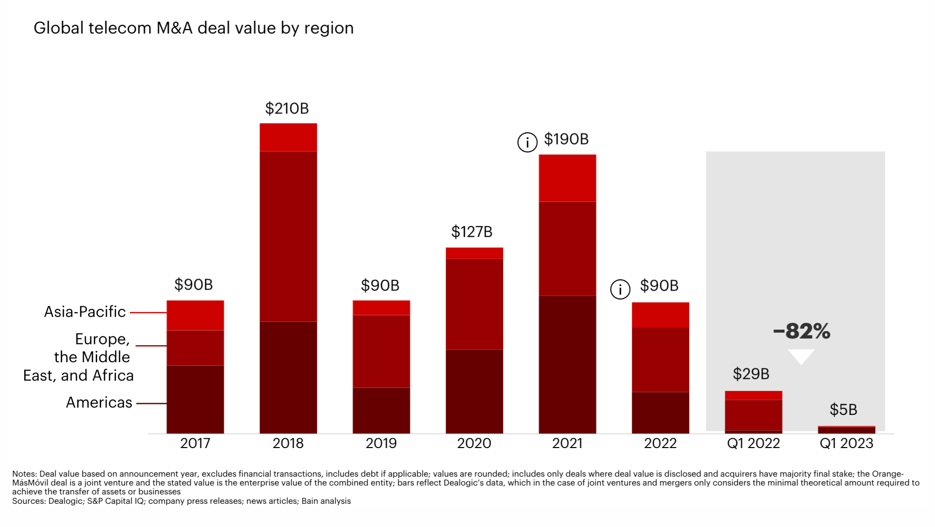 Bain’s recent Telecom M&A report shows an 82% year-over-year drop in telecom M&A deal value in the first quarter of 2023.